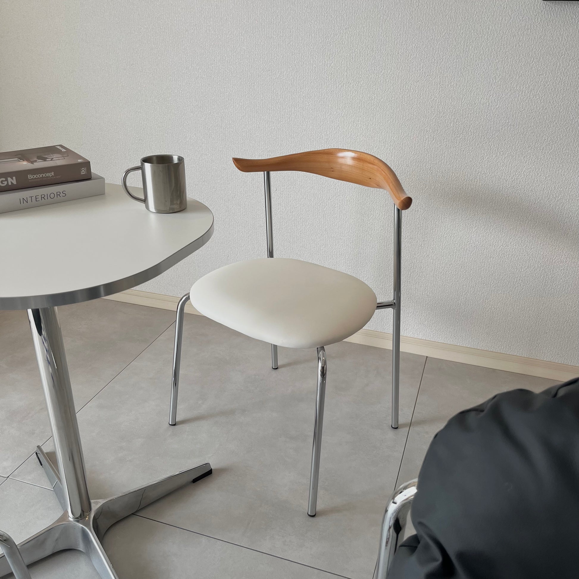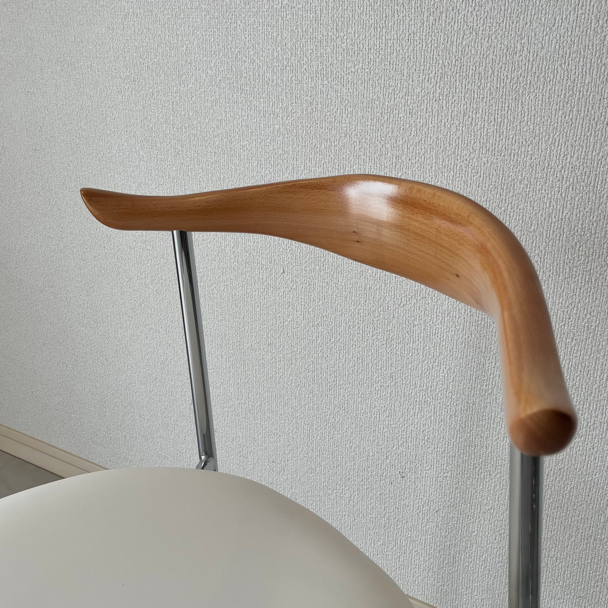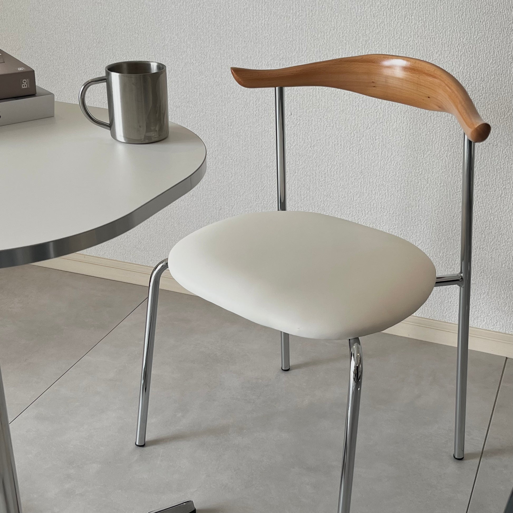 曲線が美しいウッドの背もたれと、すっきりとしたクローム脚が印象的なチェア。座面のクッションは長時間座りやすい程よい柔らかさで、座り心地も抜群。ミニマルな空間にも映える、洗練されたデザインです。