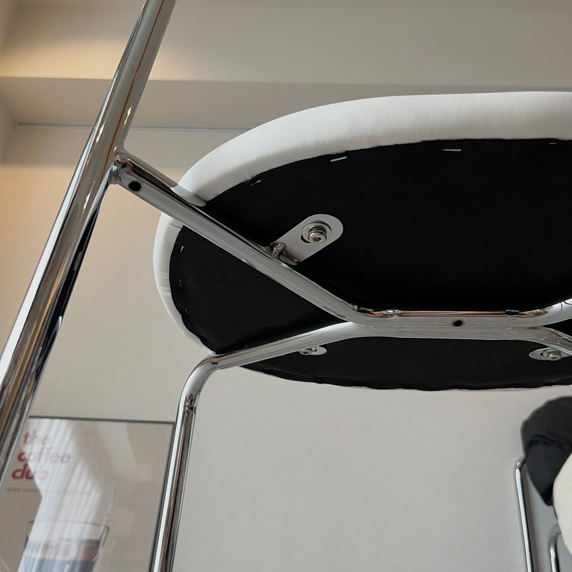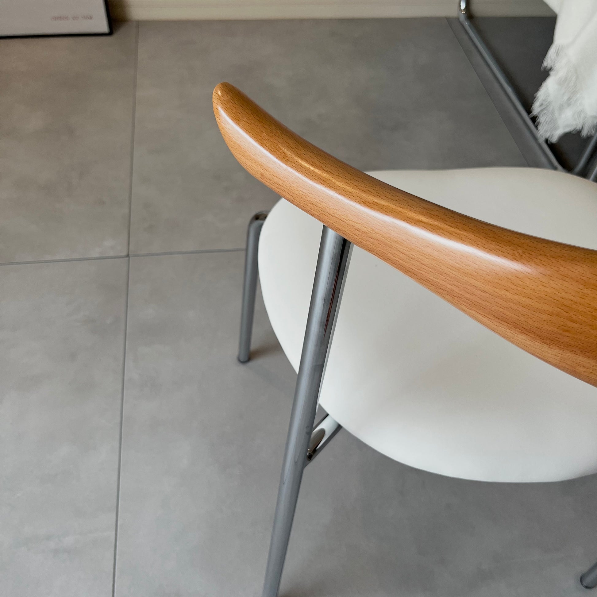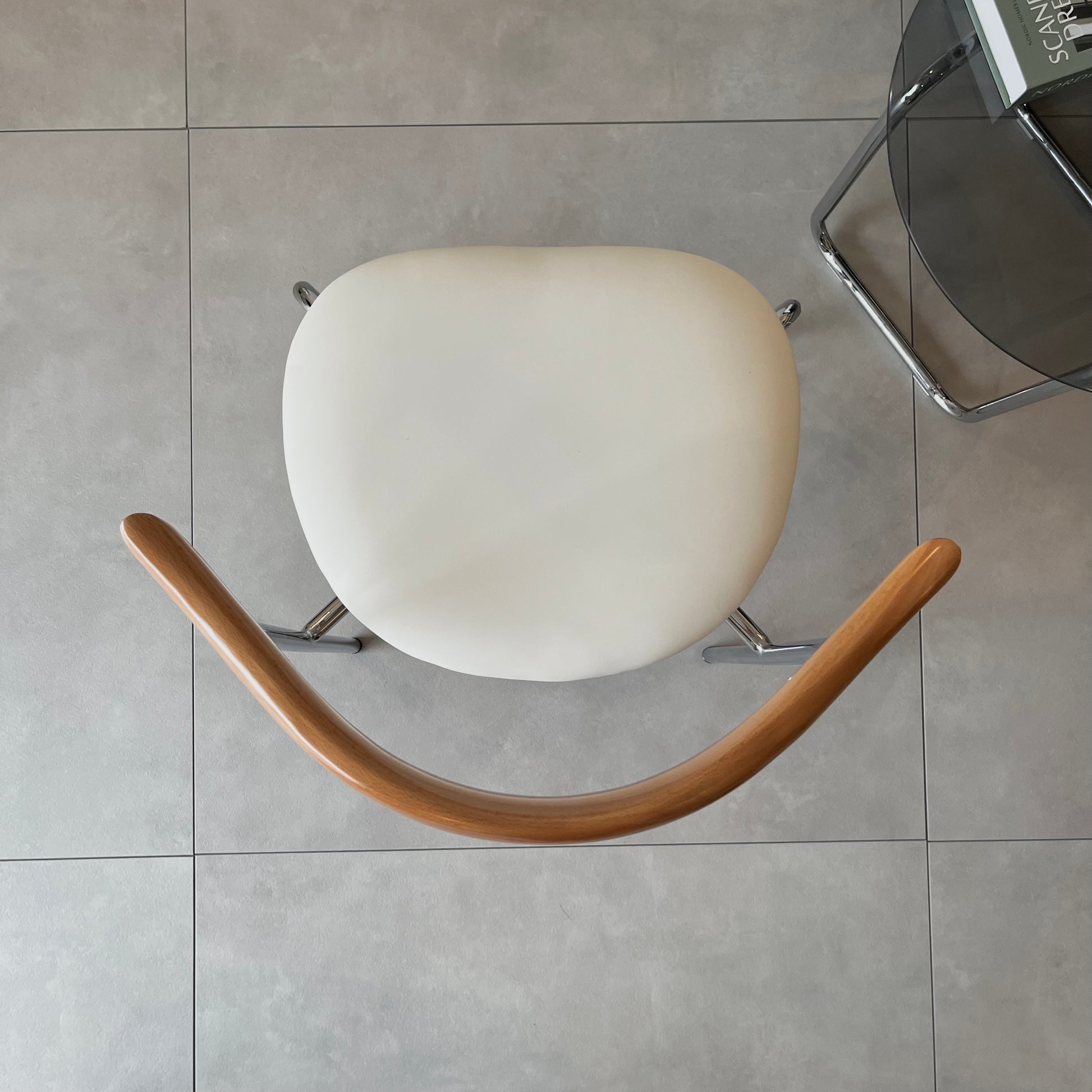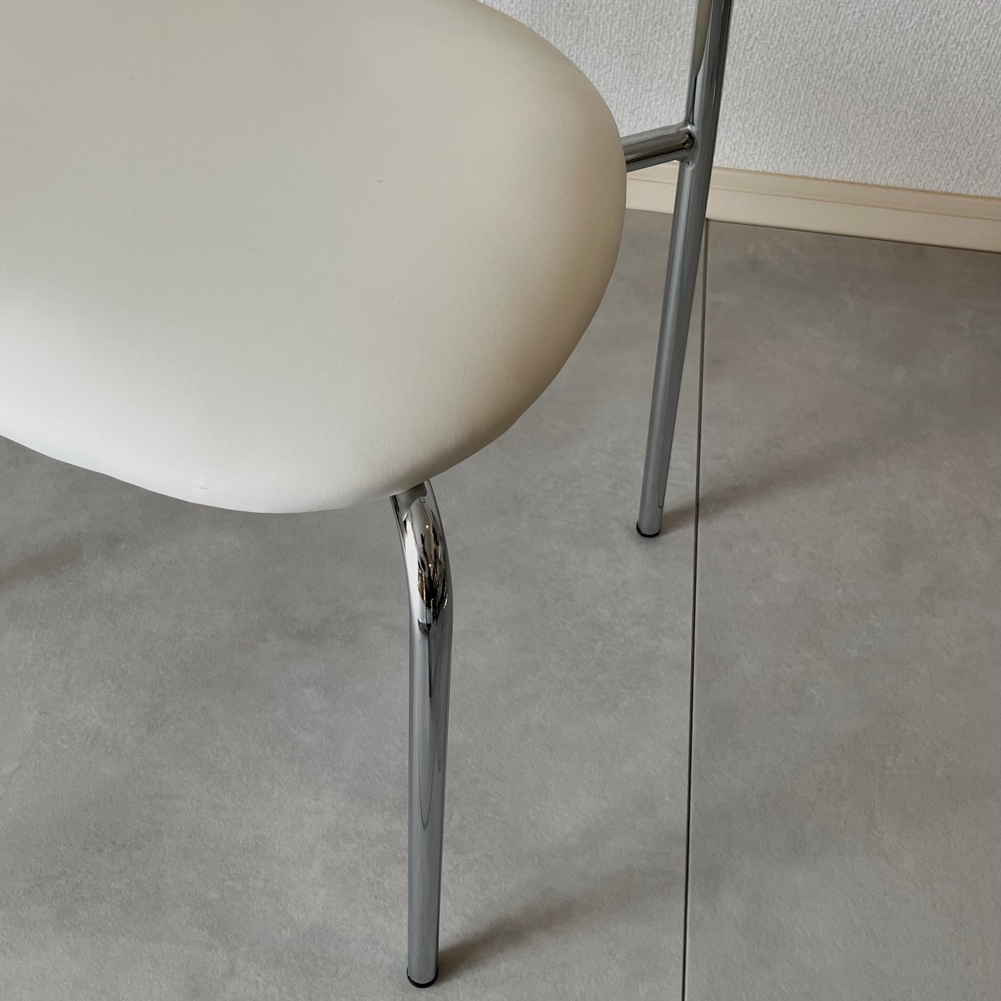 曲線が美しいウッドの背もたれと、すっきりとしたクローム脚が印象的なチェア。座面のクッションは長時間座りやすい程よい柔らかさで、座り心地も抜群。ミニマルな空間にも映える、洗練されたデザインです。