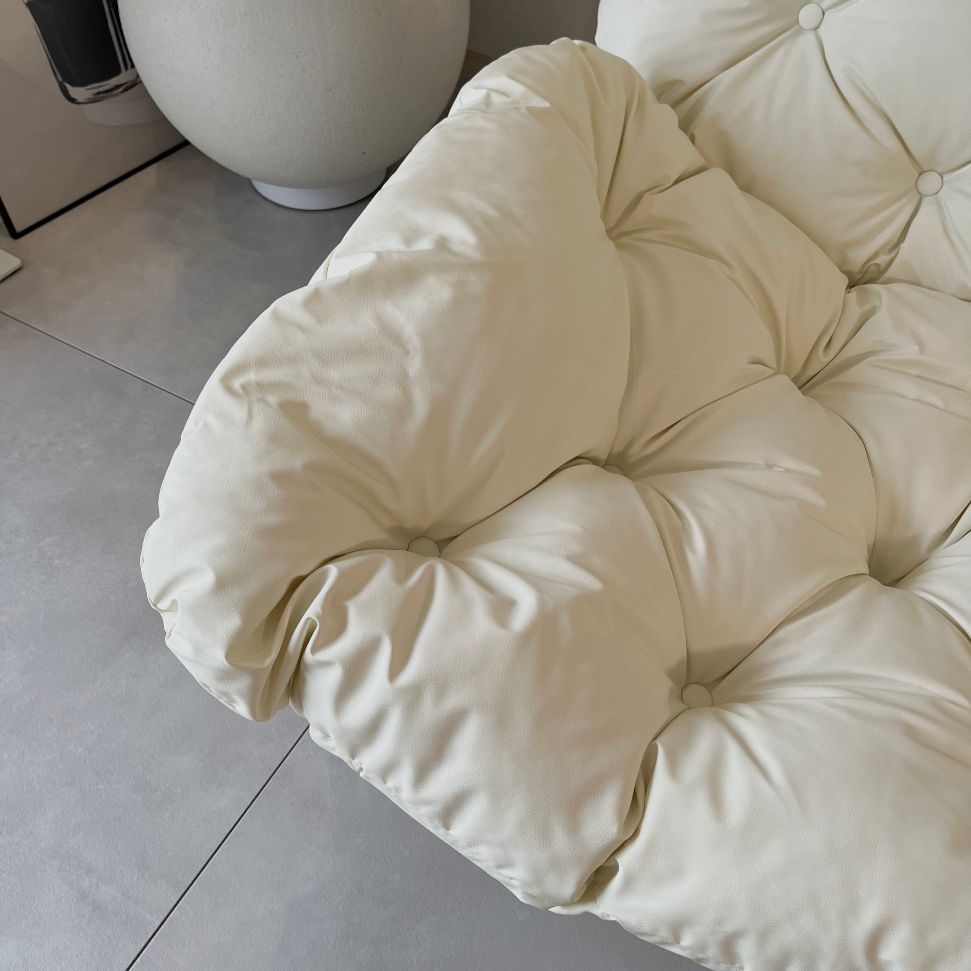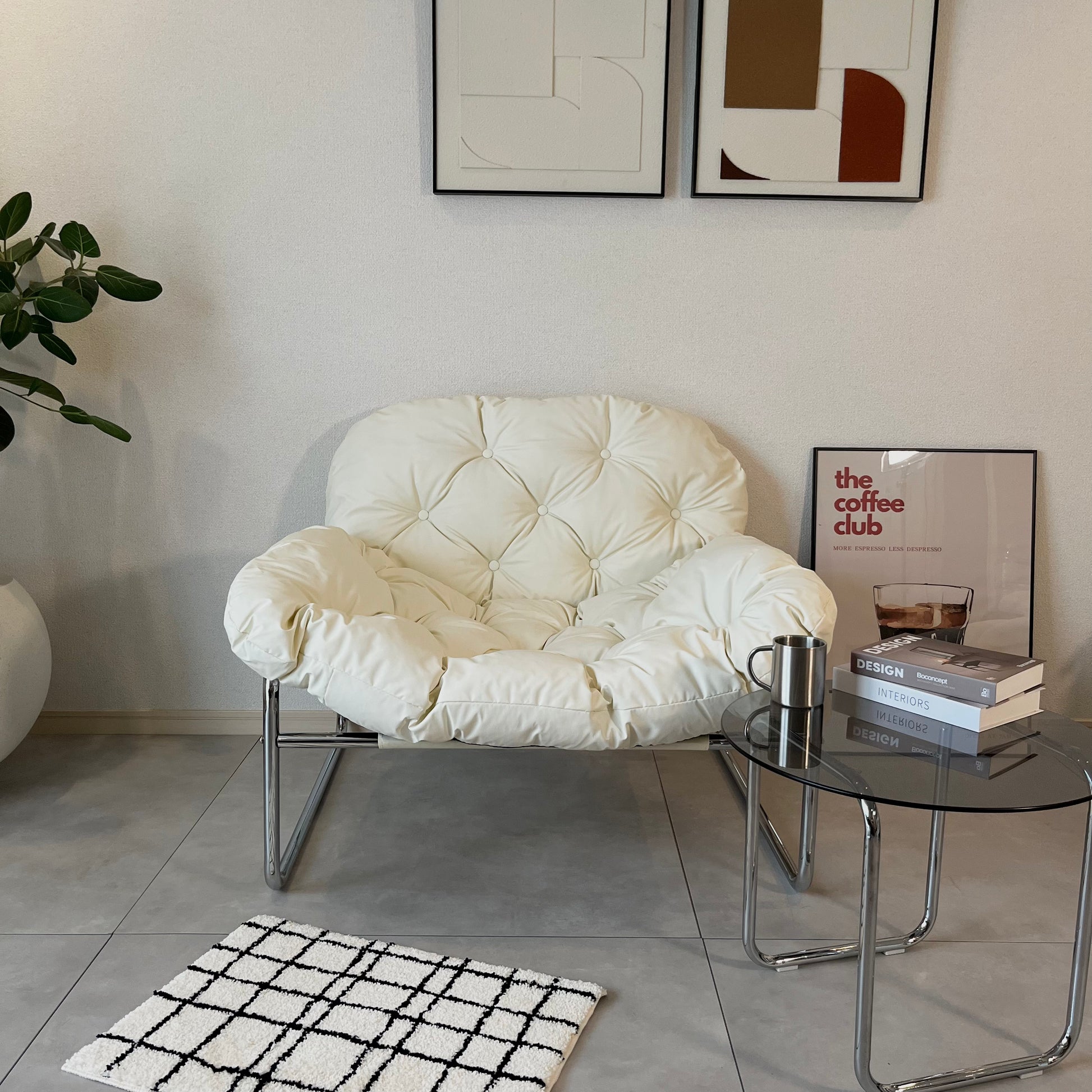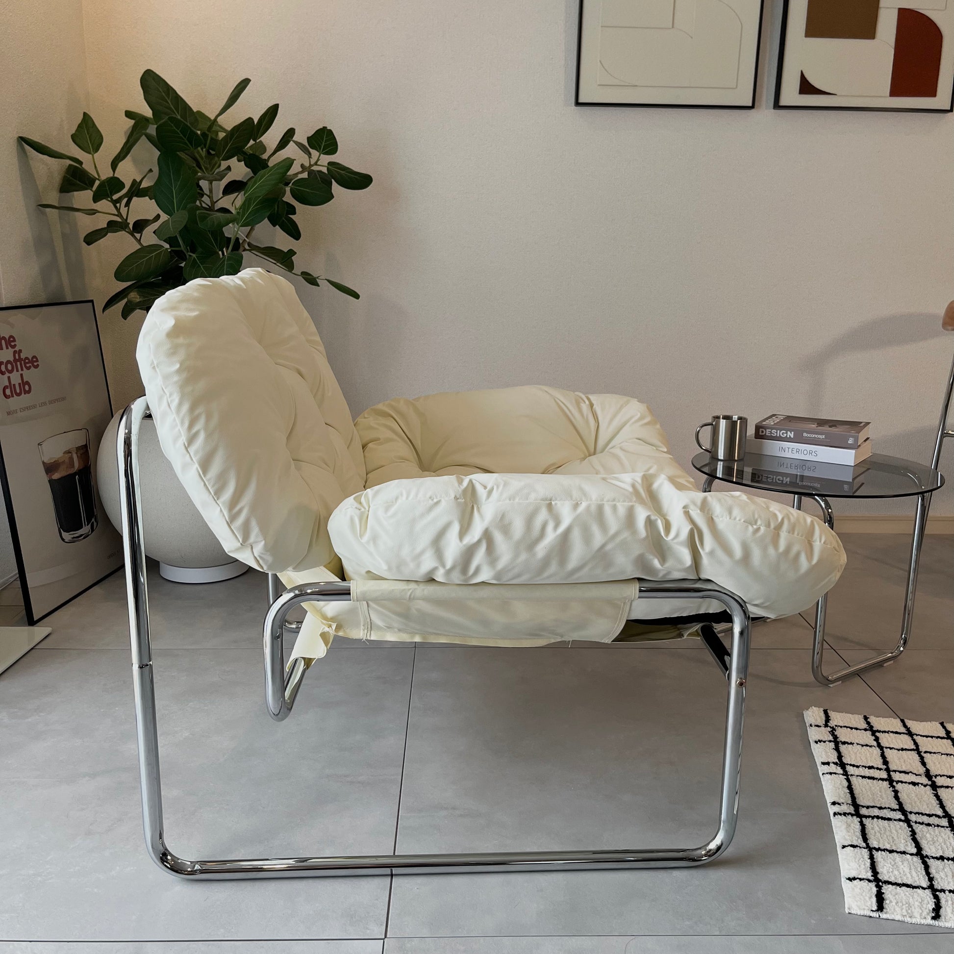 ふかふかの座り心地で、ゆったりとくつろげるラウンジチェア。フェイクレザーの質感が空間にほどよい上品さを添え、モダンなインテリアにも自然に馴染みます。丸みのあるフォルムとシルバーの脚が、シンプルながら洗練された印象を演出。置くだけで空間の雰囲気が引き締まります。