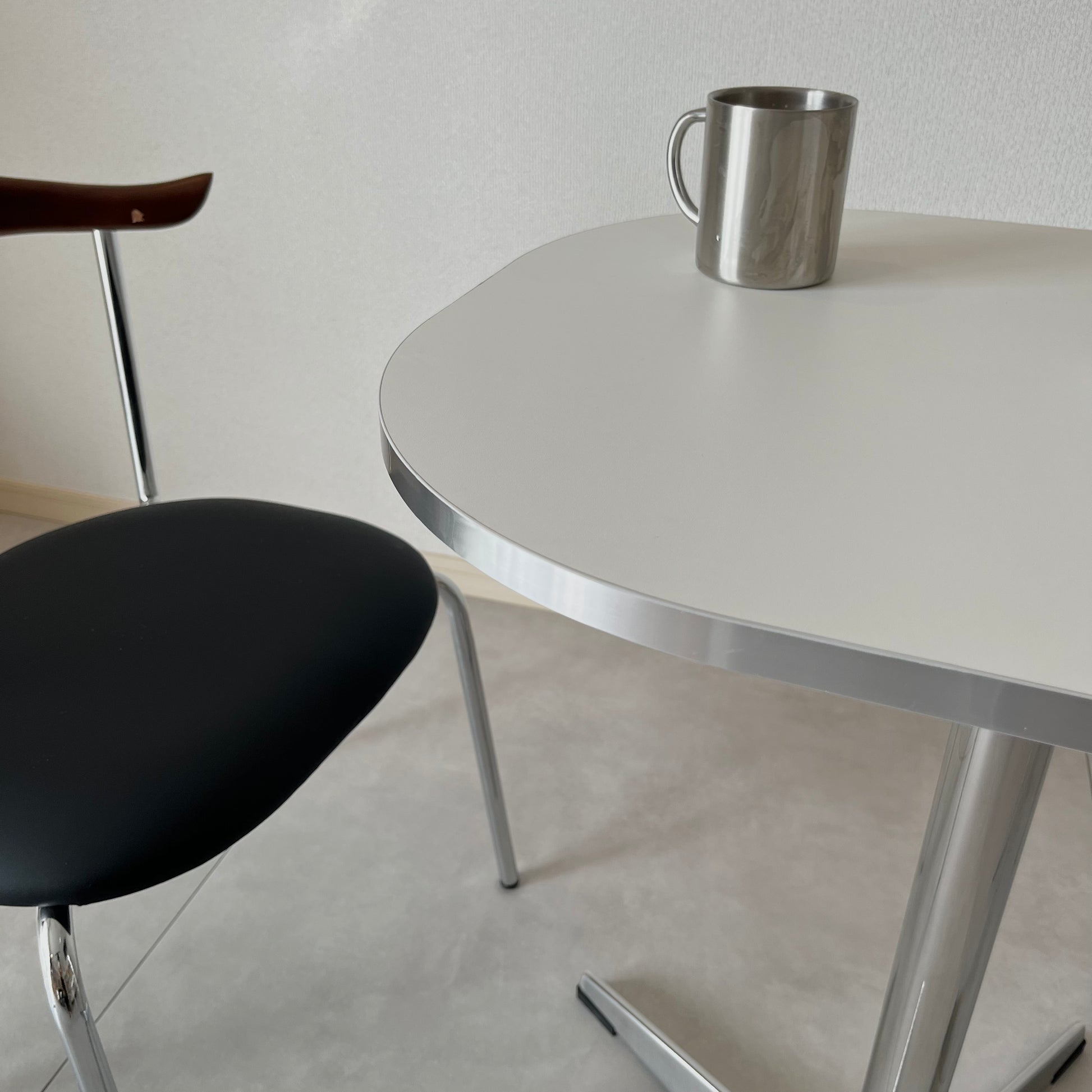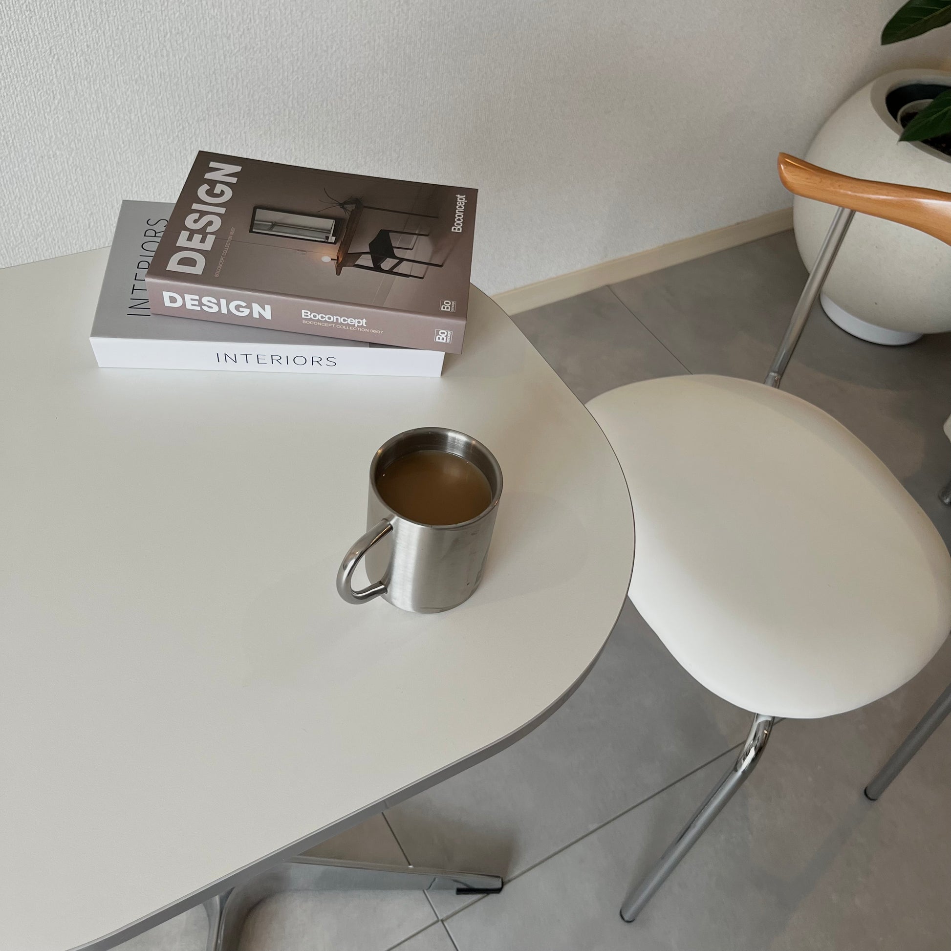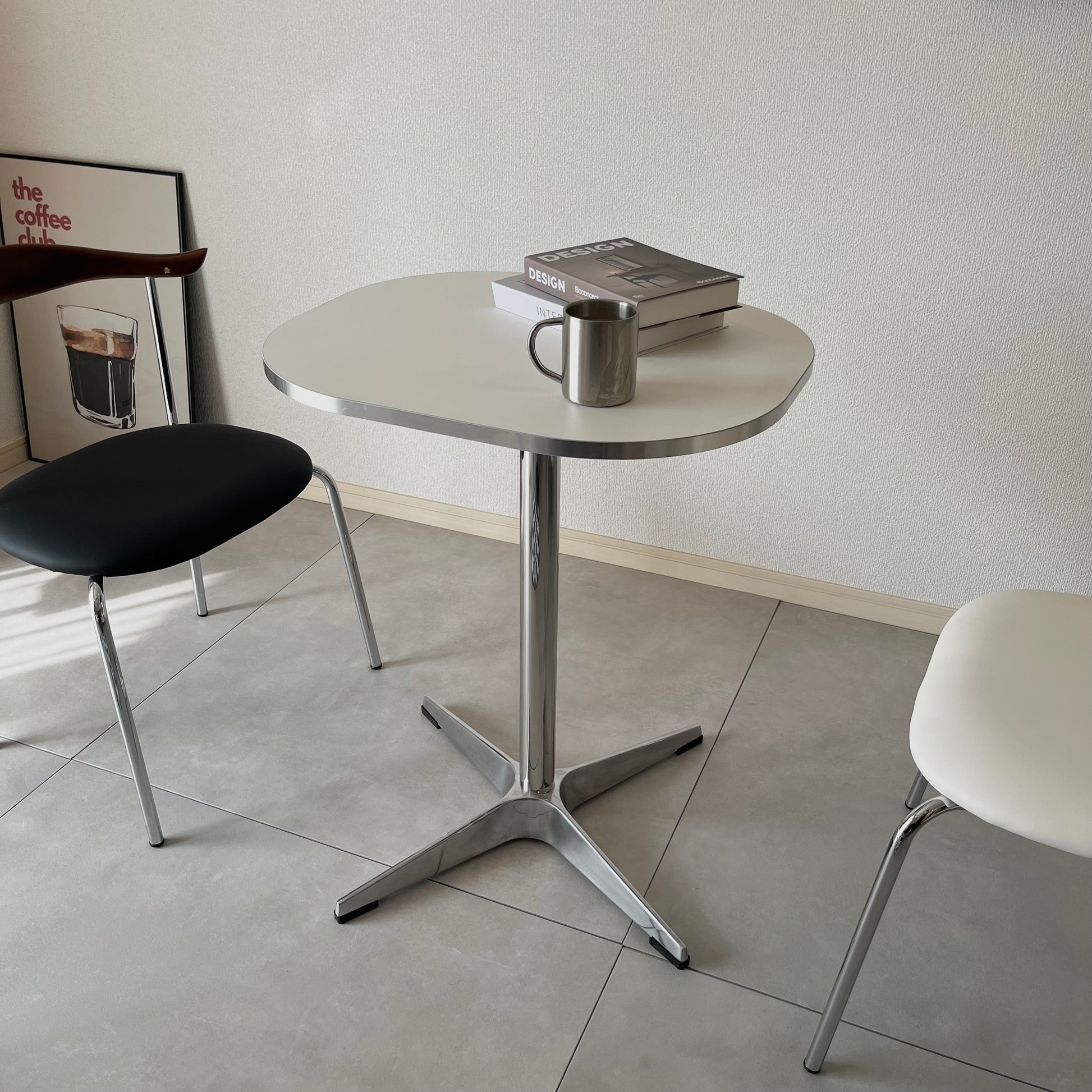 すっきりとしたメタルベースに、楕円形の天板が印象的なテーブル。直線ではなく、あえて曲線を選ぶことで、空間にやさしいリズムと抜け感を生み出します。ミニマルな中にも個性が光る一台です。(写真はMサイズ)