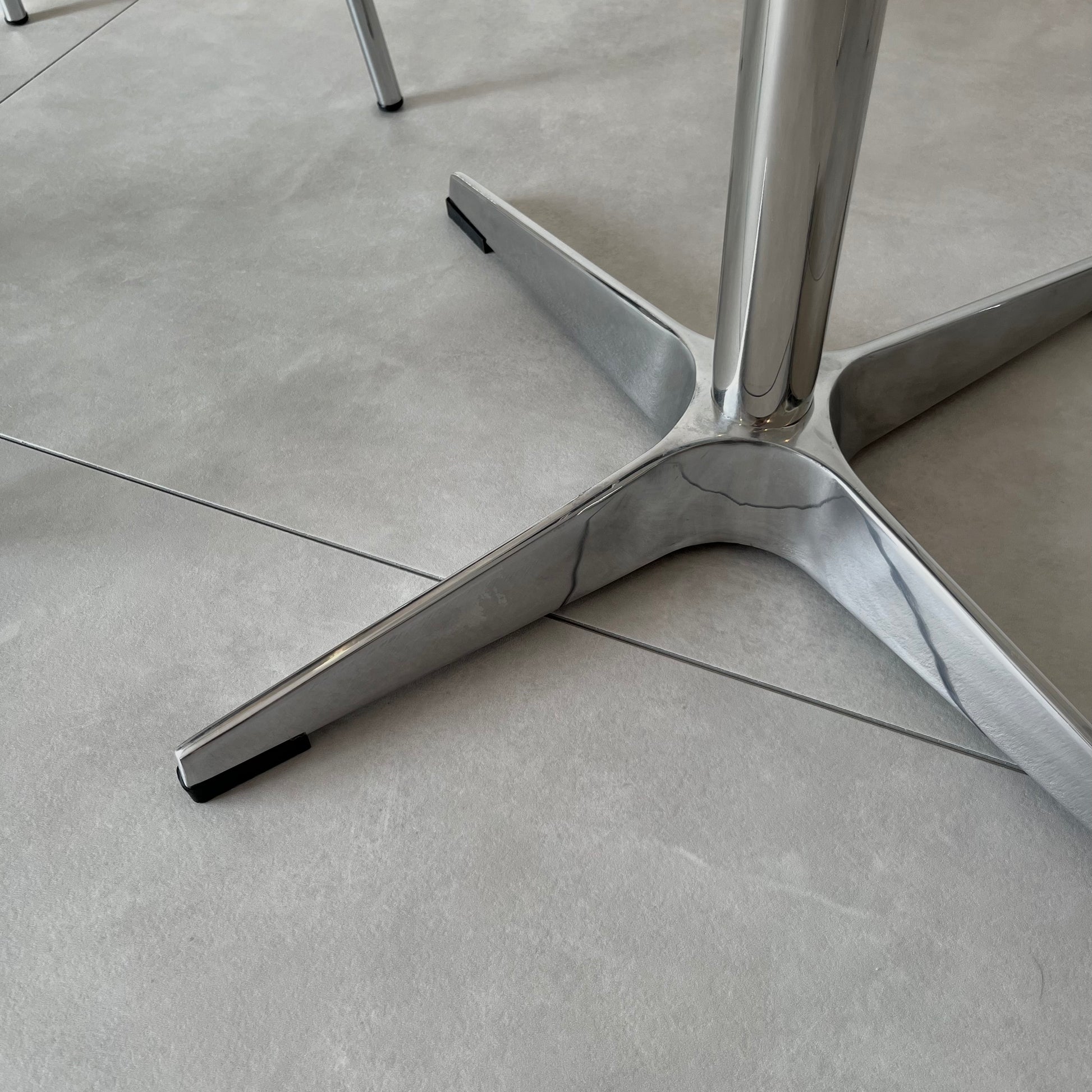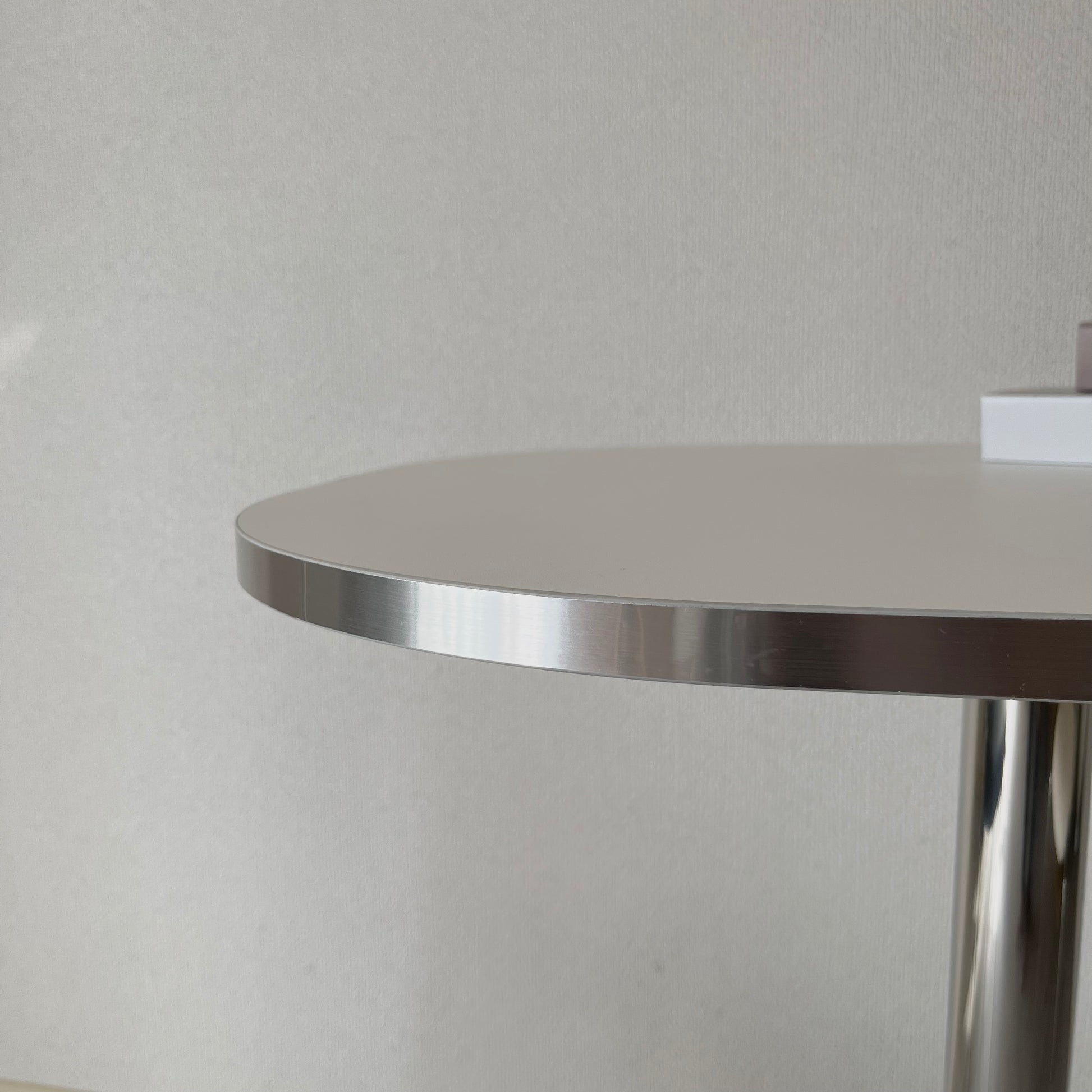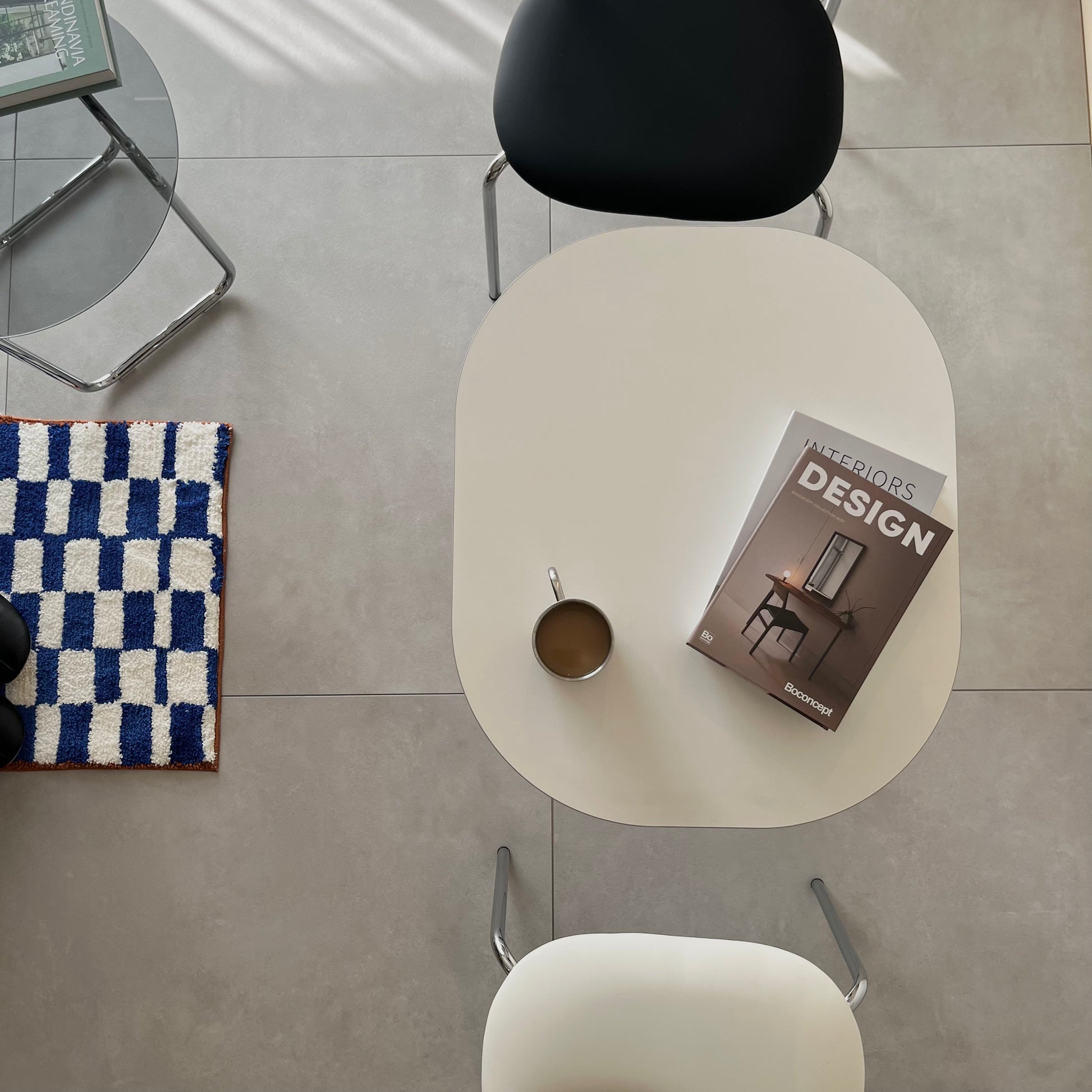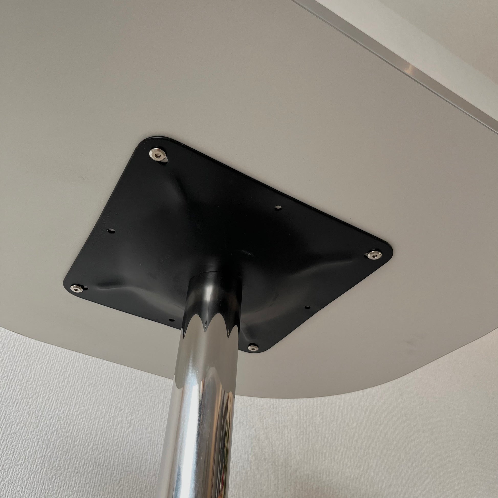 すっきりとしたメタルベースに、楕円形の天板が印象的なテーブル。直線ではなく、あえて曲線を選ぶことで、空間にやさしいリズムと抜け感を生み出します。ミニマルな中にも個性が光る一台です。(写真はMサイズ)